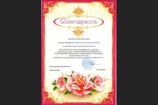 С 26-27 ноября 2015 года в Узбекистане в г. Бухара проходила Республиканская научная конференция с участием зарубежных ученых "Математическая физика и родственные проблемы современного анализа" приуроченная к 85-летию Бухарского государственного университета. Более 30 преподавателей, профессоров и студентов выступили на ней с интересными докладами. Выступления проходили как на русском, так и на узбекском языках.